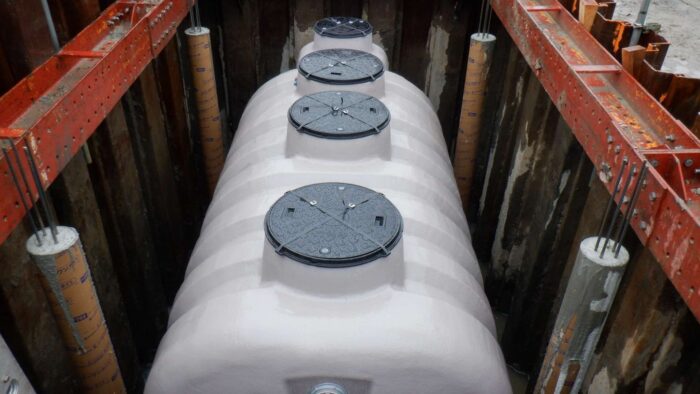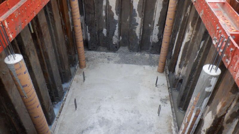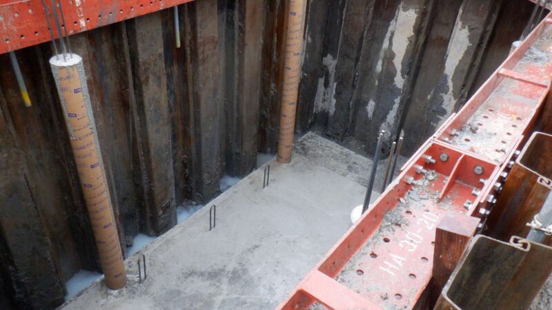 新設合併浄化槽埋設工事。地盤が悪いのでシートパイル打設。基礎コンクリート打設して柱も打設して設置しました。
